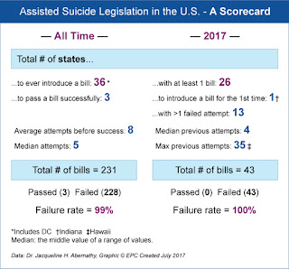 The analysis, to be presented at the 2017 National Euthanasia Symposium in Toronto on October 28, included all bills introduced in 36 states and the District of Columbia since 1994. Of the 231 total bills, nearly one-fifth (43 bills) were introduced just this year in 26 states and all attempts failed. This increase in the number of attempts to legalize assisted suicide is notable due to the fact that such bills have greater than a 99 percent failure rate. Only three have been signed into law in the last 23 years. In spite of the volume of bills introduced this past year, 100 percent of these attempts failed while Alabama tightened their assisted suicide statute.